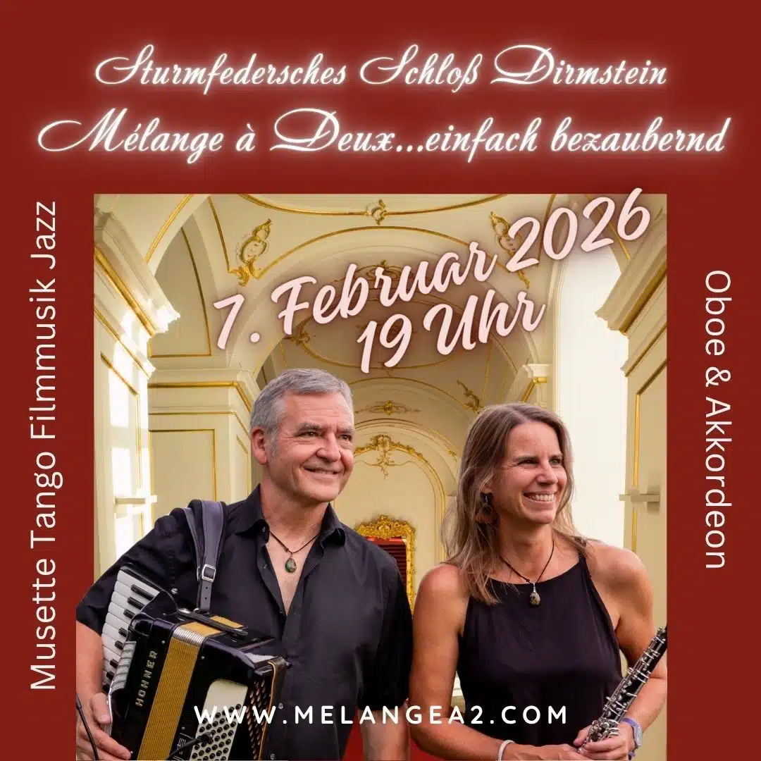 Am 7. Februar musiziert das Duo im Sturmfederschen Schloss in Dirmstein. Der Ratssaal ist für kammermusikalische Konzerte ein wunderschöner Raum. Karten können Sie hier auf der Homepage reservieren und an der Abendkasse ab 18 Uhr abholen.