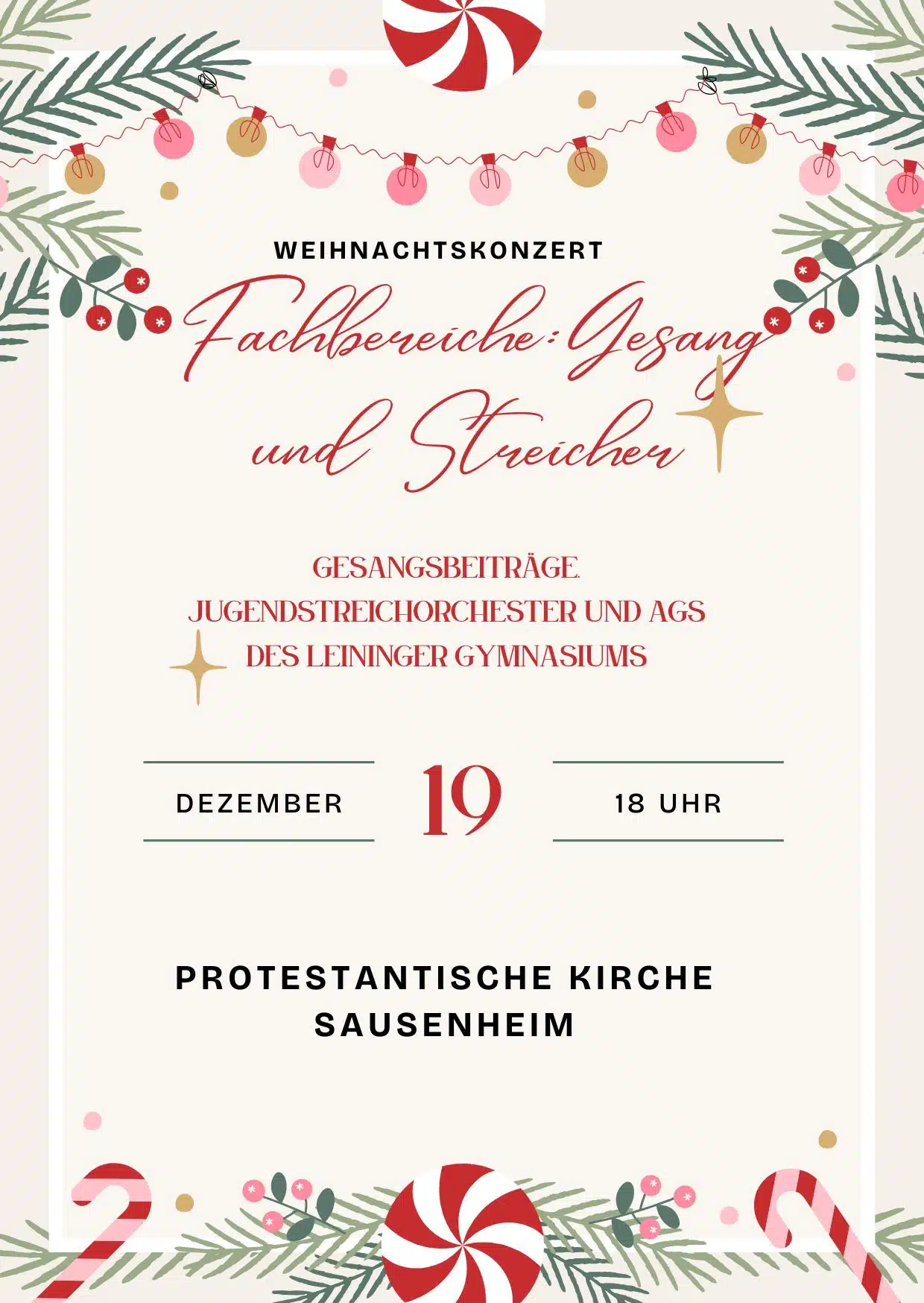 Wie in jedem Jahr findet auch in 2025 wieder das Fachbereichskonzert Gesang in der prot. Kirche in Sausenheim statt. In diesem Jahr musizieren die Sängerinnen und Sänger mit dem Fachbereich der Streicher zusammen. Unter der Leitung von Heidi König erklingt festliche Adventsmusik des Jugendstreichorchesters und AGs des Leininger Gymnasiums. Gesangsschüler von Volker Gütermann und Annike […]