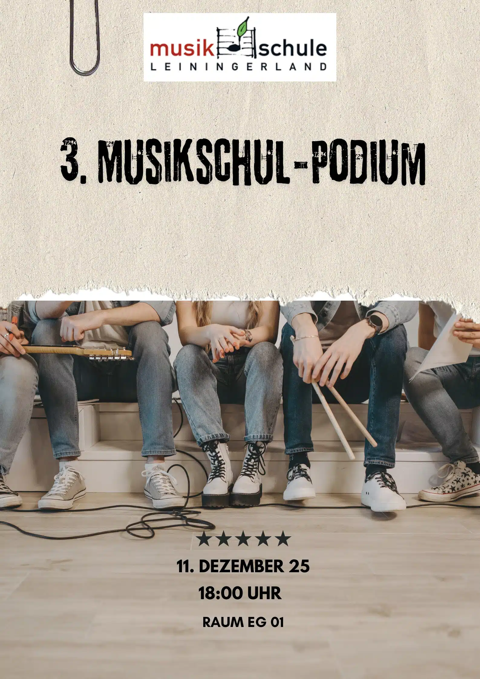 Das dritte Musikschulpodium findet an der Musikschule in Grünstadt statt. Schülerinnen und Schüler der Musikschule dürfen die Möglichkeit nutzen sich in kleinem und geschütztem Rahmen einer Publikumssituation zu stellen. Diese Konzertreihe ist ganz ausdrücklich und besonders auch für Anfänger geeignet.